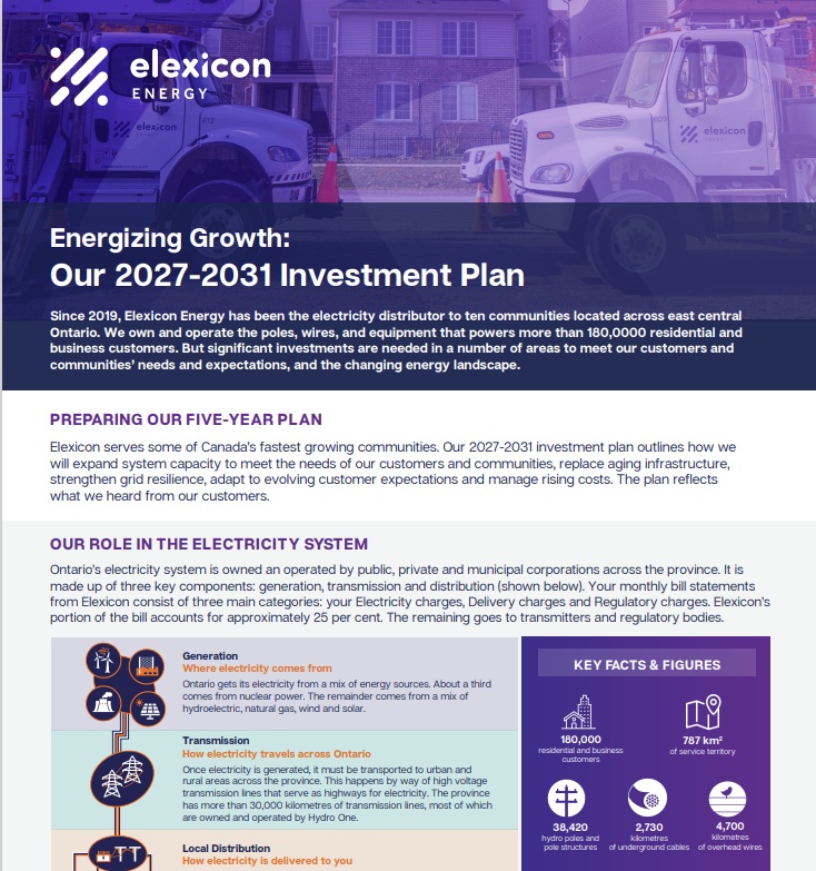 Our 2027–2031 Investment Plan: Energizing Growth sets out how Elexicon will build the capacity needed to support growing communities, renew aging infrastructure, enhance grid resilience, respond to evolving customer expectations, and address rising costs. Shaped by customer feedback, the plan will be reviewed through the Ontario Energy Board’s transparent public process.